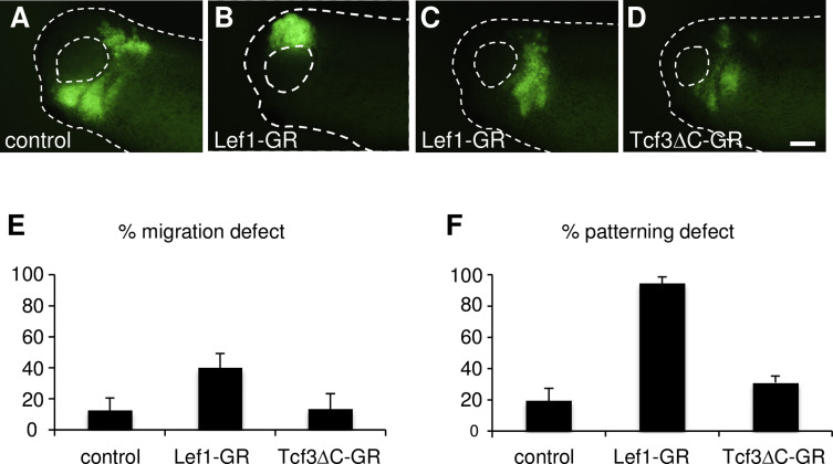 Fig. 4. Activation of canonical Wnt signaling negatively affects the migration of transplanted NC cells. Activation of canonical Wnt signaling in NC cells inhibits migration and affects the patterning of the cranial NC streams. The migration of NC transplants from embryos injected with GFP (A), Lef1-GR and GFP (B,C) or Tcf3âC-GR and GFP (D) RNA was analyzed at tadpole stages. A Migrating GFP transplant. B Lef1-GR transplant that does not migrate. C Lef1-GR transplant showing a NC patterning defect. D Migrating Tcf3âC transplant. Dashed white lines indicate the embryo head. E Graph summarizing three independent transplantation experiments showing defects in NC migration (n =60). F Graph summarizing the NC patterning defects of the same experiments presented in E. Note that here the migration defects shown in (E) were also counted as patterning defects. Scale bar =200 µm. |