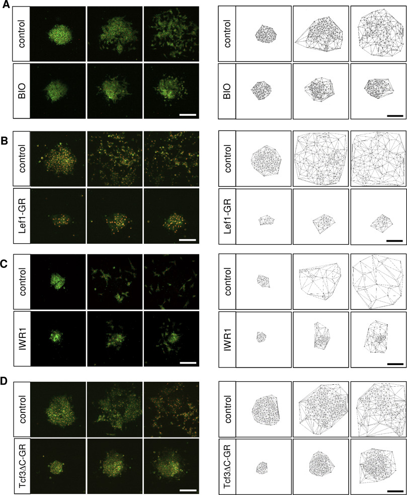 Fig. 5. Modulation of canonical Wnt signaling results in defects in in vitro NC migration. The left panel shows time-lapse images and the right panel shows the respective Delauney triangulations as a measure of cell dispersion. A Time-lapse images of control (upper panels) and BIO-treated NC cells (lower panels) at the start of imaging (0 h) and after 2 and 3.5 h. B Time-lapse images of control (upper panels) and Lef1-GR overexpressing NC cells (lower panels) at the start of imaging (0 h) and after 3 and 5 h. C Time-lapse images of control (upper panels) and IWR1-treated NC cells (lower panels) at the start of imaging (0 h) and after 3 and 5 h. D Time-lapse images of control (upper panels) and Tcf3âC-GR overexpressing NC cells (lower panels) at the start of imaging (0 h) and after 3 and 5 h. The scale bars resemble 200 µm. |