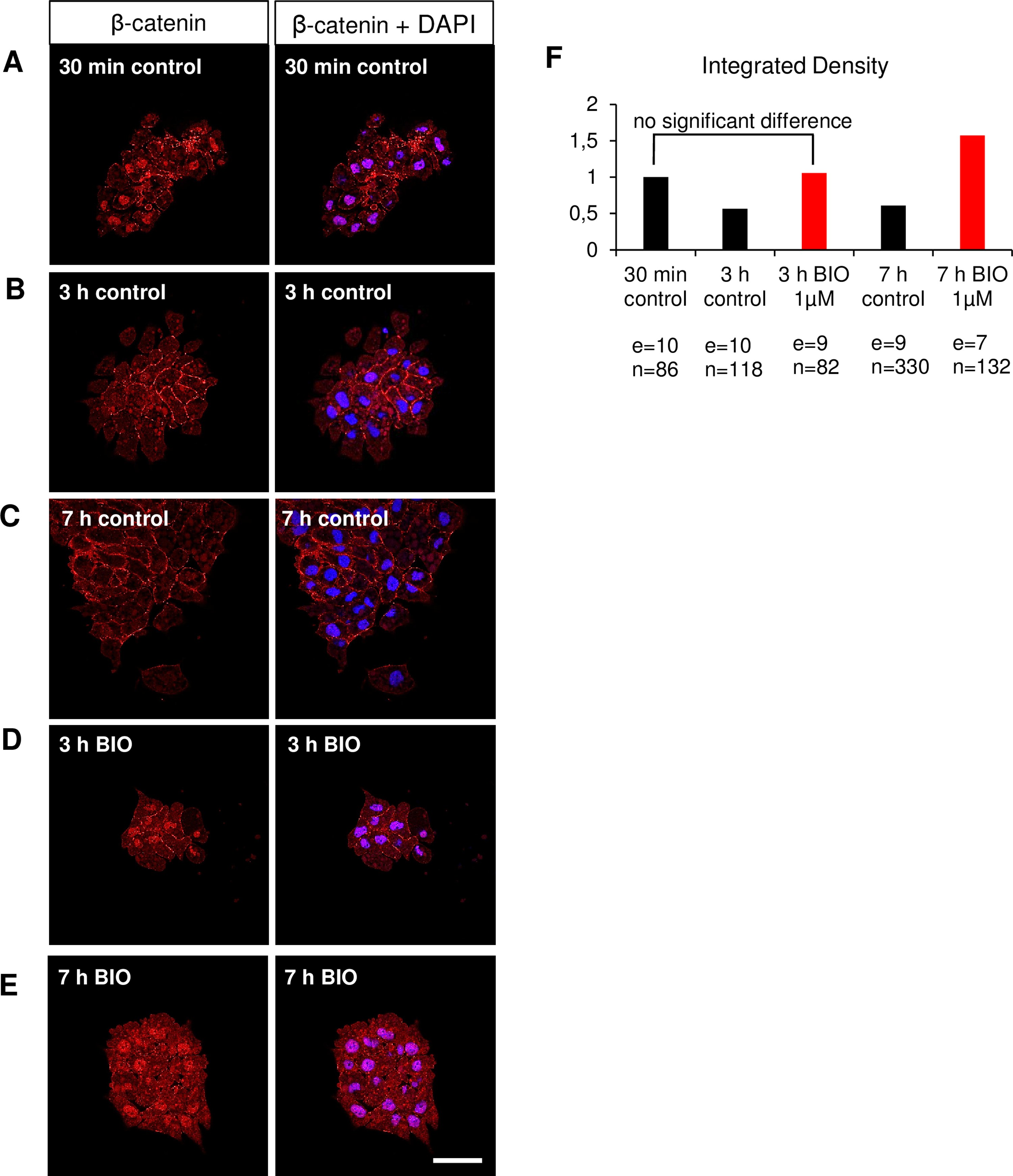 Supplementary material Supplementary Fig. 6 The levels of nuclear β-catenin change during stages of NC migration and are upregulated by BIO treatment. NC explants were dissected at premigratory stages and fixed at premigratory stages (30 min after explantation) or migratory stages (3 h or 7 h after explantation). β-catenin localization was determined by immunostaining. A β-catenin is predominantly localized in the nucleus and also at the plasma membrane in premigratory NC explants. B,C Early migratory and migratory NC explants show mainly membrane localization of β-catenin. D,E NC explants treated with 1 µM BIO for 3 h (D) or 7 h (E) showing translocation of β-catenin into the nuclei and elevated levels of cytoplasmic β-catenin. F Graph summarizing averaged fluorescent intensity expressed as Integrated Density of control and BIO-treated explants. The area of each nucleus was determined by DAPI staining and the intensity of the β-catenin fluorescent signal expressed as Integrated Density was measured using ImageJ. Integrated Densities of β-catenin fluorescent signals from all explants of a particular treatment were averaged and normalized to the premigratory controls. One Way ANOVA and post hoc Games-Howell test were used for statistical analysis. Numbers of nuclei and explants analyzed are indicated for each column. BIO treatment leads to increased nuclear β-catenin compared to controls. One Way ANOVA and post hoc Games-Howell test confirm that NC explants treated with 1 µM BIO for 3 h (D) show similar levels of nuclear β-catenin compared to untreated NC explants fixed 30 min after explantation (A). The scale bar resembles 50 µm. |