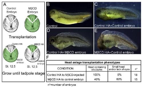 The MβCD cholesterol depletion phenotype is head autonomous. (A) Grafting of head anlage (HA) at stage 12.5. (B) Control embryo not grafted. (C) Control embryo grafted with HA from control embryo. (D) MβCD injected embryo grafted with control HA. (E) Control embryo grafted with MβCD HA. (F) Table showing the quantification of experiment.