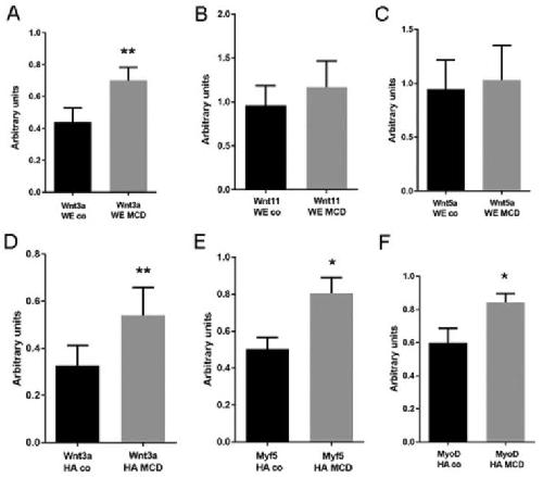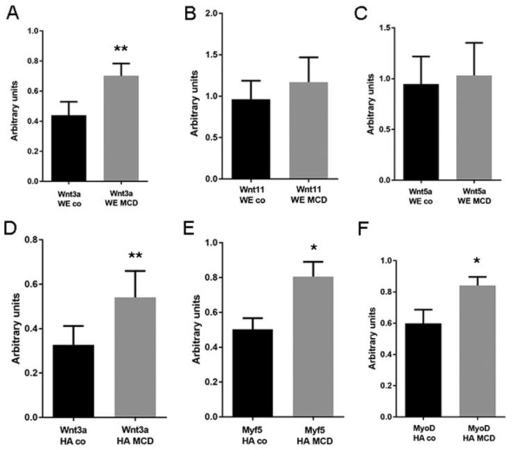 Densitometric analysis of Fig. 4A RT-PCR. (A) Wnt3a whole embryo control (Wnt3a WE co) and whole embryo injected with MβCD (Wnt3a WE MCD); (B) Wnt11 whole embryo control (Wnt11 WE co) and whole embryo injected with MβCD (Wnt11 WE MCD); (C) Wnt5a whole embryo control (Wnt5a WE co) and whole embryo injected with MβCD (Wnt5a WE MCD); (D) Wnt3aHead Anlage control (Wnt3a HA co) and Head Anlage injected with MβCD (Wnt3a HA MCD); (E) Myf5Head Anlage control (Myf5 HA co) and Head Anlage injected with MβCD (Myf5 HA MCD); (F) MyoDHead Anlage control (MyoD HA co) and Head Anlage injected with MβCD (MyoD HA MCD). Statistical significance: *P < 0.05 **P < 0.01.