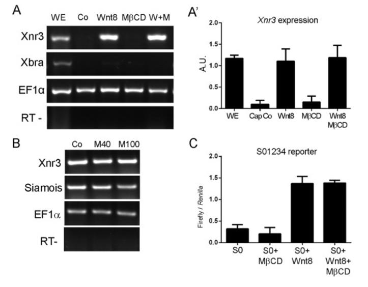 Maternal Wnt signaling is not affected by MβCD cholesterol depletion. (A) Animal cap assay revealed that Xnr3 and Xbra expression is not altered by MβCD injection. (Aâ²) Densitometric analysis of Xnr3 expression from three independent experiments. (B) Maternal MβCD treatment does not alter Xnr3 or siamois expression. (C) MβCD injection does not affect the reporter gene activity at stage 10. S0 (S01234 reporter).