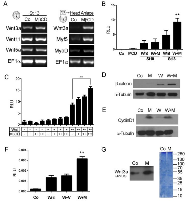 CRMM disruption enhances the Wnt/β-catenin signaling pathway activation. (A) RT-PCR showing expression of wnt3a and target genes myf5 and myoD increased in whole embryos and dissected head anlage. (B) TOP-FLASH reporter activation is increased by cholesterol depletion at stage 13 but not at stage 10. (C) RKO-cells showing Wnt signaling activity enhanced by MβCD in synergism with Wnt conditioned medium. (D, E) Western blotting showing higher levels of β-catenin and CyclinD1 after cholesterol depletion. Co (control), M (MβCD), W (Wnt), W + M (Wnt conditioned medium and treated with MβCD). (F) L-cell conditioned medium enhances Wnt activity in RKO-cells after cholesterol depletion. Co (conditioned medium from L-cell non-secreting Wnt), Wnt (conditioned medium from Wnt-secreting L-cell), W + V (conditioned medium from Wnt-secreting L-cell treated with vehicle), W + M (conditioned medium from Wnt-secreting L-cell treated with MβCD). (G) Western blotting showing increase in total Wnt protein from conditioned medium after L-cell producing Wnt MβCD treatment. Coomassie blue stained gel after electrophoresis showing loaded proteins. Statistical significance: **P < 0.01.