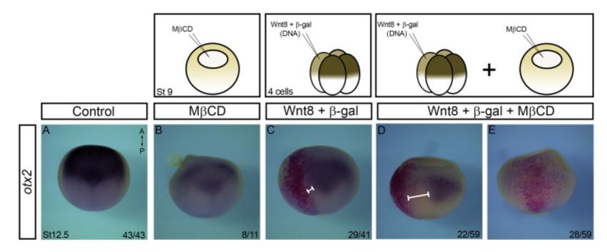 MβCD cholesterol depletion increases Wnt field activity. (A) Otx2 expression in a control embryo. (B) Otx2 expression in MβCD injected embryo. (C) Wnt8 and β-gal DNAs were injected at dorsal side from 4-cell stage embryos. (DâE) Wnt8, β-gal and MβCD injected embryos. The white bars represent the distance from wnt8 expressing area to otx2 expression.