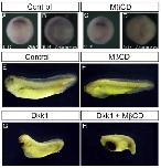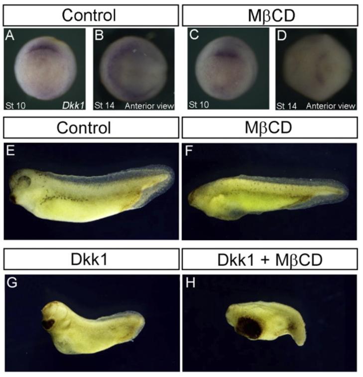 dkk1 expression and spreading is affected by cholesterol depletion. (AâD) In situ hybridization showing dkk1 expression domain at stages 10 and 14 in control embryos and cholesterol depleted embryos by MβCD. (E) control embryo. (F) MβCD injected embryo. (G) dkk1 mRNA injected embryo. (H) dkk1 mRNA and MβCD injected embryo.