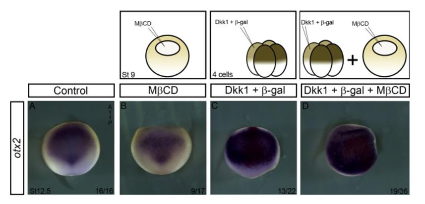 Cholesterol depletion by MβCD potentiates the dkk1 overexpression phenotype. (A) Uninjected embryo showing otx2 expression anteriorly. (B) otx2 expression is reduced after MβCD injection. (C) dkk1 mRNA and β-gal injection at 4-cell stage causes the enhancement of otx2 expression. (D) dkk1 mRNA and β-gal injection at 4-cell stage and MβCD injection at stage 9 increased the otx2 expression domain.