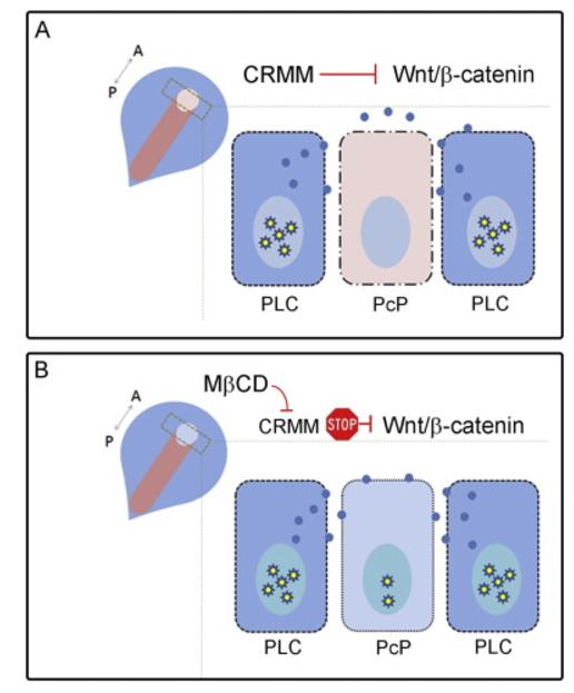 Membrane microdomains as an additional mechanism of anterior protection from Wnts. (A) The prechordal plate (PcP) is protected from Wnt signals secreted by the posterolateral cells (PLC) through antagonist secretion and CRMM. (B) After cholesterol depletion by MβCD, PcP cells lose the CRMM. The secreted antagonists together with the decreased dkk1 expression make the PcP cells vulnerable to the Wnt signaling and impair head development.