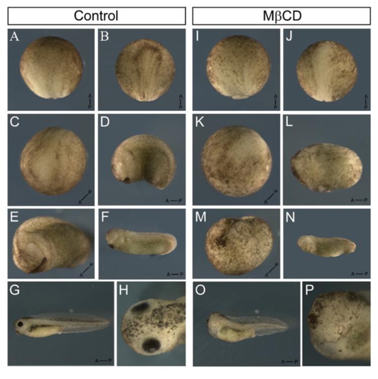 Control (AâH) and MβCD-injected (Isingle bondP) Xenopus laevis embryos observed during development, from stage 12 to tadpole stages.