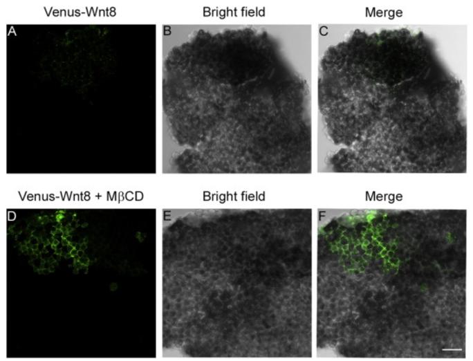 Venus-Wnt8 mRNA was injected in one blastomere at 4-cell stage and MβCD injection was conducted at stage 8.5. Confocal images were obtained at stage 9, after animal cap dissection. Scale bar: 100 μm.