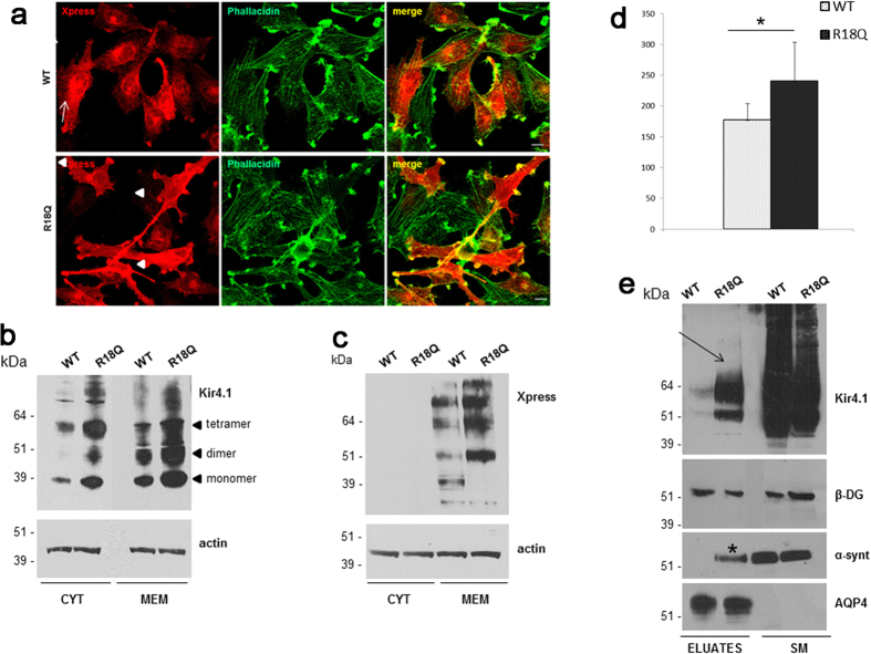Figure 2. WT and mutated Kir4.1 expression and distribution in U251 astrocytoma cells.(a) Co-immunofluorescence staining of Kir4.1 WT and R18Q expressing cells using Anti-Xpress epitope Ab to stain recombinant Kir4.1 (red) and phallacidin to stain actin filaments (green) shows that WT channels are mostly localized in the cytoplasm, and at plasma membrane in a low percentage of cells (top panels, arrows), while R18Q mutant channels are mainly distributed along cell membranes, filopodia-like structures and cell-cell contacts (bottom panels, arrowheads), and partially co-localizes with actin, in the majority of cells (70%). (b,c) Western Blot (WB) analysis of total membrane and cytosolic protein extracts of astrocytoma cells expressing WT and R18Q Kir4.1, probed with anti Kir4.1 Ab (b) and Anti-Xpress epitope tag Ab (c) revealed that R18Q is more abundantly expressed in the cytoplasm (CYT) and particularly in the total membrane protein fraction (MEM), than the WT protein. Anti-Xpress epitope tag Ab does not detect Kir4.1 protein in the cytoplasm. Arrowheads on the right of panel b highlight the monomeric and oligomeric forms of the Kir4.1 channel. Actin is used as loading control. Molecular weight markers are on the left (kDa). (d) Densitometric analysis of recombinant Kir4.1 bands derived from total membrane protein extracts from WT or R18Q Kir4.1 expressing cells, detected by anti-Xpress Ab and normalized to the corresponding actin value (mean ± SEM, expressed as arbitrary units; *P < 0.05 from three independent experiments). (e) WB of total cell proteins (SM) and enriched fraction of plasma membrane proteins after biotinylation experiments (Eluates) probed with anti–Kir4.1 Ab. Higher amount of R18Q Kir4.1 is expressed at the plasma membrane (arrow) when compared to Kir4.1 WT. Among Kir4.1 associated proteins α-syntrophin (α-synt) is found at plasma membrane of Kir4.1 R18Q mutant expressing cells (asterisk) but not in WT expressing cells. No differences are observed in β-dystroglycan (β-DG) and AQP4 association to astrocytoma plasma membrane. One representative experiment out of two performed with the same results has been shown. |