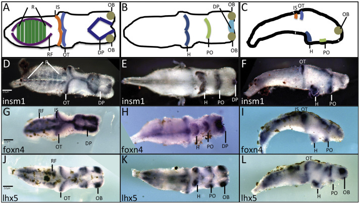 Fig. 2. insm1 expression in the developing brain. A â C. Diagrammatic representation of selected brain regions as viewed in dorsally (A), ventrally (B) or laterally (C). D â L. Whole mount in situ hybridizations of stage 45 dissected brains using probes for insm1 (D â F), foxn4 (G â I), or lhx5 (J â L). insm1 is expressed in the dorsal pallium, optic tectum and rhombomeres as viewed dorsally (D). insm1 expression was also detected ventrally (E) and laterally (F) in the hypothalamus, preoptic area and isthmus. Scale bars (1 μM) are indicated in (D) for (D â F), (G) for (G â I) and (J) for (J â L). Abbreviations: DP â dorsal pallium, H â hypothalamus, IS â isthmus, OB â olfactory bulb, OT â optic tectum, PO â preoptic area, RF â reticular formation, R â rhombomeres.