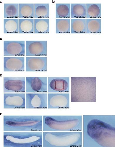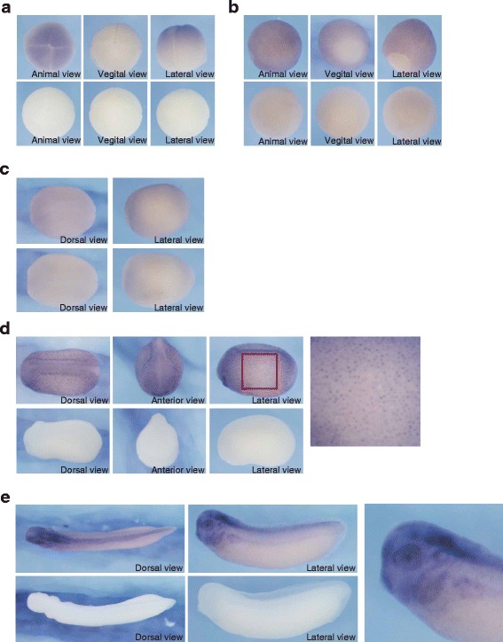 Fig. 1. Spatial expression of Xenopus laevis hace1 in early development. Expression of hace1 during Xenopus laevis development was analyzed by whole-mount in situ hybridization using an antisense probe (upper panels) and sense probe as a control (lower panels). a, b At stage 4 (a) and 11 (b), hace1 was expressed throughout the presumptive ectoderm. c At stage 15, hace1 expression was weakly detected at the dorsal ectoderm. d At stage 23, hace1 was expressed in the neural tissue and also showed spotty expression in the epidermis. The rightmost panel shows a magnification of the red boxed region. e