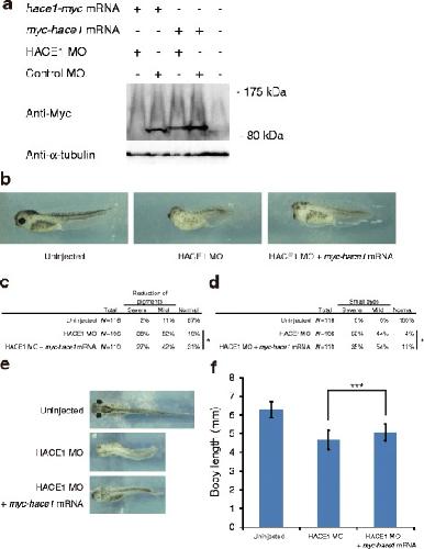 N, number of total eyes we evaluated. The right eye and left eye of each embryo were separately evaluated. e, f The body length of embryos at stage 40-41 was quantified (Uninjected, nâ=â59; HACE1 MO, nâ=â53; HACE1 MOâ+âmyc-hace1 mRNA, nâ=â55). Values are expressed as the meanâ±âs.d. ***Pâ<â0.001 (with Bonferroni correction), unpaired t-test