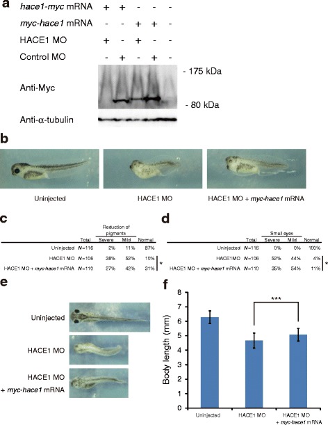 Fig. 2. Dorsal depletion of hace1 leads to multiple developmental defects. a Immunoblot analysis shows that HACE1 MO inhibited translation of hace1-myc mRNA but not that of myc-hace1 mRNA used for rescue experiments. Xenopus laevis embryos were injected with the indicated sets of MOs (30 ng) and mRNAs (1.2 ng). α-tubulin was a loading control. b Embryos were injected with 30 ng of HACE1 MO alone (middle panel) or 30 ng of HACE1 MO plus 1.2 ng of myc-hace1 mRNA (right panel) into the animal region of two dorsal blastomeres at the four-cell stage. c, d Embryos were classified into severe, mild, and normal groups on the basis of the extent of each defect. *Pâ<â0.05 (with Bonferroni correction), MannâWhitney U-test. c