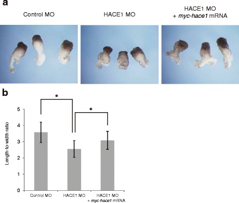 Fig. 5. Knockdown of hace1 by HACE1 MO2 leads to a phenotype similar to that caused by HACE1 MO treatment. a Embryos were injected with 50Â ng of Control MO (left panel) or 50Â ng of HACE1 MO2 (right panel) into dorsal blastomeres at the four-cell stage and fixed at stage 38/39. Representative results from two independent experiments are shown (Control MO, nâ=â39; HACE1 MO2, nâ=â40) (b, c) Embryos were classified into severe, mild, and normal groups on the basis of the extent of each defect. b