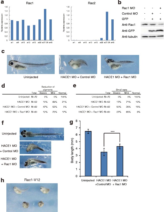 Fig. 6. Defects in hace1 morphants are partly rescued by coinjection of Rac1 MO. a Temporal expression patterns of Xenopus laevis rac1 and rac2. The expression levels of rac1 and rac2 were analyzed by qRT-PCR. Expression levels were normalized to those of Xenopus laevis ornithine decarboxylase 1 (odc1). b Immunoblot analysis shows that Rac1 MO inhibited translation of endogenous Rac1. Xenopus laevis embryos were injected with the indicated MOs (70 ng in total) and gfp mRNA (0.2 ng). α-tubulin was a loading control. c Coinjection of Rac1 MO (50 ng) and HACE1 MO (30 ng) led to milder developmental defects than did coinjection of control MO (50 ng) and HACE1 MO (30 ng). Anterior is to the left, and dorsal is to the top. d, e Embryos were classified into severe, mild, and normal groups on the basis of the extent of each defect. f, g The body length of embryos at stage 40-41 was quantified. Dorsal views of embryos are shown with anterior to the left. Values are expressed as the meanâ±âs.d. ***Pâ<â0.001, unpaired t-test h Embryos injected with 30 pg of Rac1-V12 (constitutively active Rac1) mRNA and 170 pg of gfp mRNA displayed phenotypes similar to those of embryos injected with HACE1 MO (nâ=â38). Anterior is to the left, and dorsal is to the top
