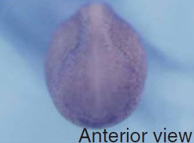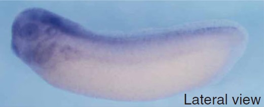 hace1 (HECT domain and ankyrin repeat containing E3 ubiquitin protein ligase 1) gene expression in Xenopus tropicalis embryo, assayed via in situ hybridization, NF stage 23, anterior view, dorsal up.