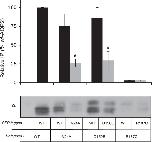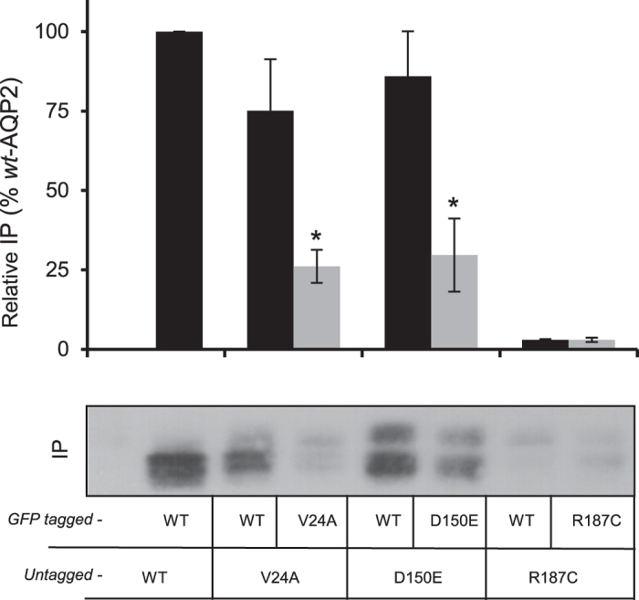 Figure 2. Immunoprecipitation of AQP2 in homozygous and heterozygous condition.Oocytes were injected with 0.5 ng mRNAs for each untagged AQP2 variants (untagged-WT, V24A, D150E and R187C) along equimolar amounts (1 ng) of corresponding GFP-tagged forms (GFP-tagged-WT, V24A, D150E and R187C) and incubated for 24 hours prior immunoprecipitation (IP) using anti-GFP (see methods). Blots were probed using anti-AQP2 and figure shows the pulled-down untagged variants (29 kDa) for every IP condition. Results are typical of 4 assays from which individual densitometry were performed and transposed in bar graph as % of wt-AQP2. Asterisks indicate statistical significance (p = 0.05) in comparison to corresponding + WT conditions.