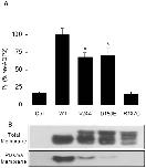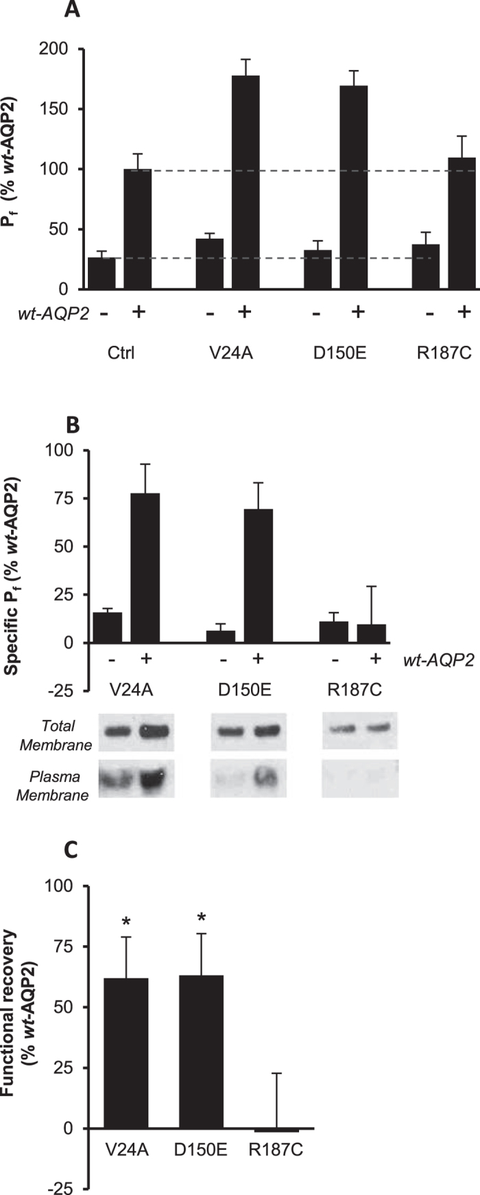 Figure 3. Functional recovery analysis for rec-AQP2 forms in oocytes.Oocytes were injected with 0.5 ng mRNA coding for wt, V24A, D150E or R187C either in absence (−) or presence (+) of same amount of wt-AQP2 and incubated for 24 hours prior testing for water permeability (Pf). Activities are presented in % ± SD of wt-AQP2 with n = 8 per condition, and is typical of 6 assays. (A) Total activity. (B) Specific activity for single (control value subtracted from all (−) expressions), and double (wt-AQP2 value subtracted from all (+) expressions) expressing conditions. (C) Gain of function for each AQP2 variant calculated by subtracting specific Pf values determined in absence (−) to those determined in presence (+) of wt-AQP2. Western blots in panel B represent specific labeling (29 kDa) for each mutant either in absence (−) or presence (+) of GFP-wt-AQP2 (58 kDa, not seen in blot), for both total and plasma membranes. Asterisks indicate statistical significance from zero (p = 0.001).
