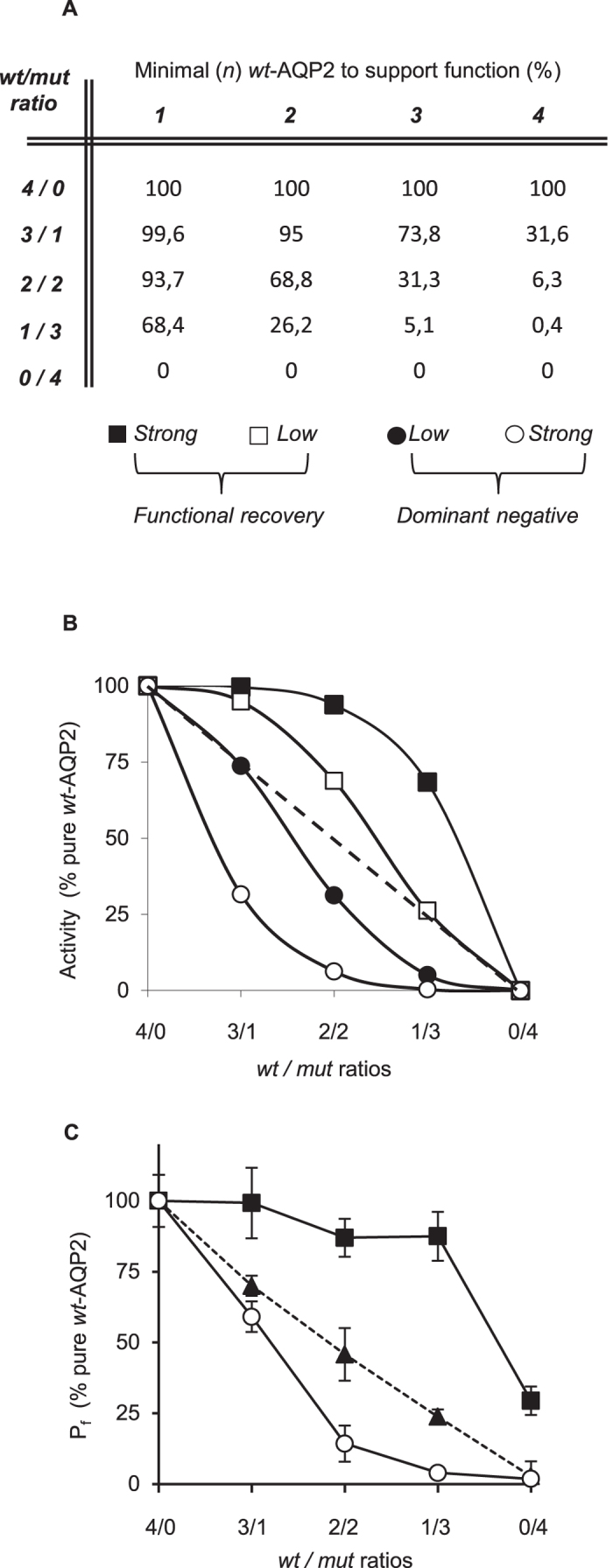 Figure 4. Functional recovery analysis in function of varying wt/mut ratios.(A) Theoretical model describing activity projections (% pure wt-AQP2) for varying wt/mut ratios (4/0 to 0/4) when assuming a minimal number of functional units within the tetramer to allow activity (n wt-AQP2 = 1 to 4). (B) Transposition of theoretical data, plotting activity levels against wt/mut ratios for each minimal requirement (n = 1 (■), 2 (□), 3 (●) or 4 (○)). Dash line represent non-interacting condition. C) Oocytes were injected with 1 ng mRNA mixtures of varying wt/mut ratios (4/0 to 0/4) combining wt–AQP2 to R254Q, D150E or R187C and incubated for 24 hours prior testing for water permeability. Activities (Pf) are presented in % ± SD of pure wt-AQP2 with n = 8 per condition and is typical of 3 assays. As shown, R254Q display typical dominant negative effect while D150E is compatible with strong functional recovery. As expected, R187C does not affect wt-AQP2 function, in accordance with its non-interfering (monomeric) nature.