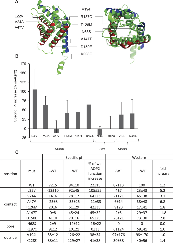 Figure 5. Functional recovery of known rec-AQP2 located in distinct areas of the protein.Oocytes were injected with 0.5 ng mRNA coding for wt, L22V, V24A, A47V, T126M, A147T, D150E, N68S, R187C, V194I or K228E either in absence (−) or presence (+) of same amount of wt-AQP2 and incubated for 24 hours prior testing for water permeability (see Fig. 3). Activities (Pf) are presented in % ± SD of wt-AQP2 with n = 3 to 8 per condition, combining 6 assays. (A) Location of the mutations within the reported structure of AQP2 (33) (red = interunit faces, blue = exofacial faces). (B) Histogram presenting gain of function ± SD for each AQP2 variant, as in Fig. 3C. (C) Table presenting specific activities (Pf) along Western bands densitometry (Western) for each mutant in both absence (−WT) and presence (+WT) of wt-AQP2.