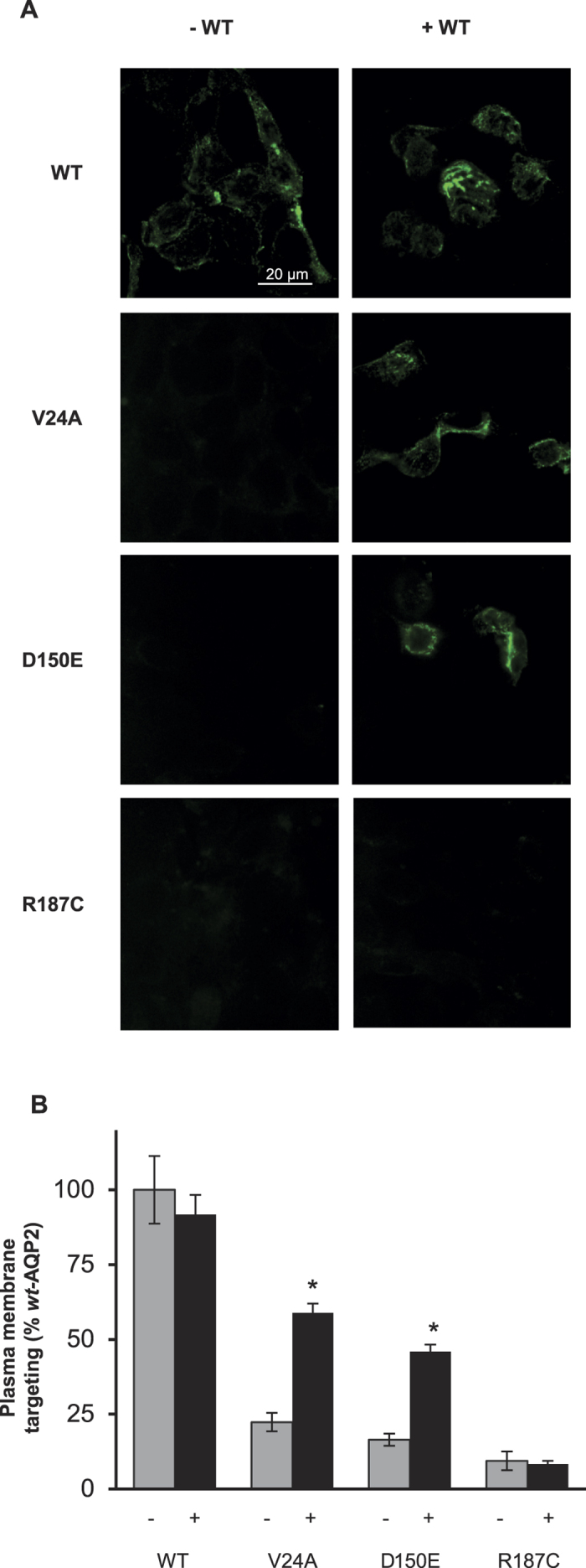 Figure 6. Functional recovery of rec-AQP2 forms in mpkCCDc14 cells.Cells grown on semipermeable filters were transfected with pBi vectors expressing FLAG-tagged AQP2 variants (V24A, D150E and R187C) as unique transcript (−) or along untagged wt-AQP2 (+) as second transcript (see methods). Immunofluorescence using anti-FLAG allowed visualization of tagged variants to evaluate effective apical membrane targeting. (A) Induction of plasma membrane targeting for V24A and D150E, but not R187C, by coexpression with wt-AQP2. (B) Histogram of positive apical membrane targeting for each condition, presenting mean ± SD of cell count in a 60x field + 8 adjacent fields, for 3 assays. Asterisks indicate statistical significance from -WT condition. (p < 0.001).