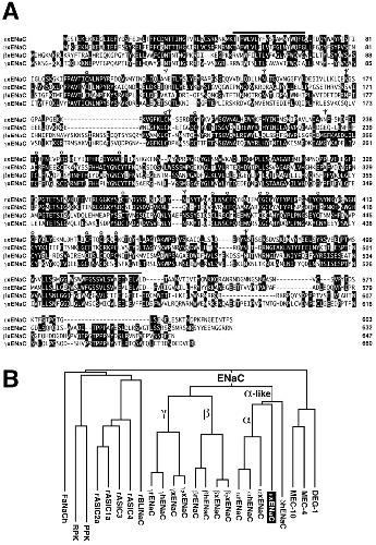 U23535 for xENaC, U25285 for xENaC, and U25342 for xENaC. B, evolutionary relationship between ENaC subunits and other family members