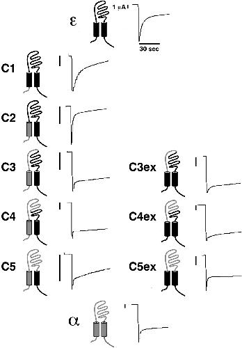 The epithelial Na+ channel (ENaC) is the apical entry pathway for Na+ in many Na+-reabsorbing epithelia. ENaC is a heterotetrameric protein composed of homologous alpha, beta, and gamma subunits. Mutations in ENaC cause severe hypertension or salt wasting in humans; and consequently, ENaC activity is tightly controlled. According to the concept of Na+ self-inhibition, the extracellular Na+ ion itself can reduce ENaC activity. The molecular basis for Na+ self-inhibition is unknown. Here, we describe cloning of a new ENaC subunit from Xenopus laevis (epsilonxENaC). epsilonxENaC can replace alphaxENaC and formed functional, highly selective, amiloride-sensitive Na+ channels when coexpressed with betaxENaC and gammaxENaC. Channels containing epsilonxENaC showed strong inhibition by extracellular Na+. This Na+ self-inhibition was significantly slower than for alphaxENaC-containing channels. Using site-directed mutagenesis, we show that the proximal part of the large extracellular domain controls the speed of self-inhibition. This suggests that this region is involved in conformational changes during Na+ self-inhibition.
