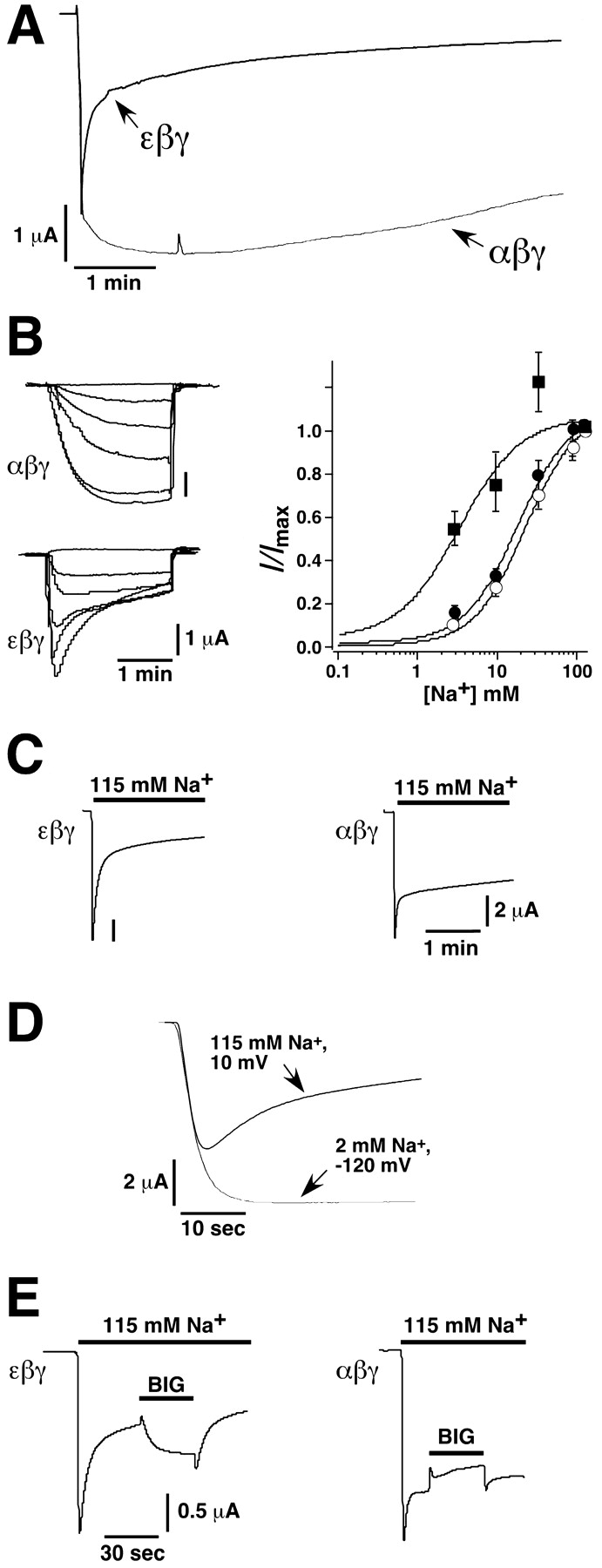 (quasi-steady state) for xENaC (closed squares). C, representative