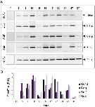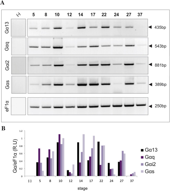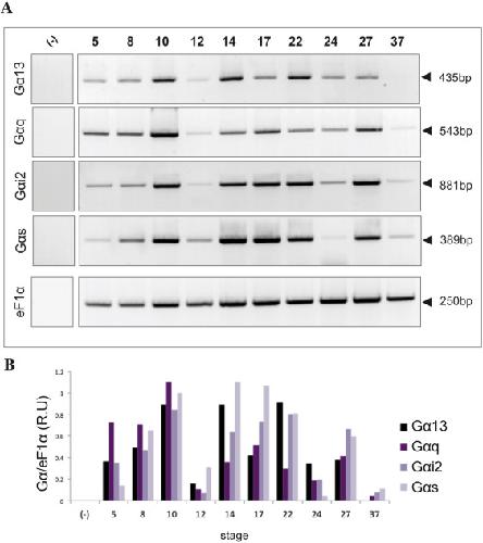 Temporal expression pattern analysis of four Gα subunits in Xenopus tropicalis during early development. The expression levels were determined by RT-PCR during different developmental stages of X. tropicalis embryos. Total RNA from each developmental stage was reverse-transcribed and amplified using specific primers for each Gα subunit gene. Amplification of the ef1α gene, and reactions performed in the absence of reverse transcriptase (-), were used as housekeeping and negative controls, respectively. A: The size of each PCR product corresponded to the theoretically predicted sizes of 435 bp (Gα13), 543 bp (Gαq), 881 bp (Gαi2), 389 bp (Gαs), and 250 bp (ef1α). Stages are indicated at the top of each lane. B: Graph showing the Gα/ef1α ratio of densitometry levels. This expression analysis was repeated at least four times and the same expression pattern was observed each time.