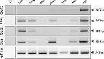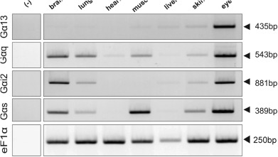 Fig. 4. Tissue specific expression pattern analysis of four Gα subunits in adult Xenopus tropicalis. The expression levels were determined by RT-PCR from different adult X. tropicalis tissues. Total RNA from each adult tissue was reverse-transcribed and amplified using specific primers for each Gα subunit gene. Amplification of the ef1α gene, and reactions performed in the absence of reverse transcriptase (-), were used as housekeeping and negative controls, respectively. The size of each PCR product corresponded to the theoretically predicted sizes of 435 bp (Gα13), 543 bp (Gαq), 881 bp (Gαi2), 389 bp (Gαs), and 250 bp (ef1α). The tissues are indicated at the top of each lane. At least four different RT-PCR analyses were performed and the same pattern expression was observed.