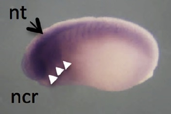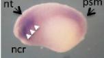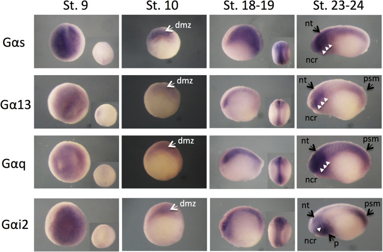 Fig. 5. Spatial expression pattern of the four representative Gα subunits during early Xenopus tropicalis development. The tissue specific expression patterns of Gα subunit transcripts at different stages of X. tropicalis embryonic development were analyzed by whole-mount in situ hybridization. Probes are indicated to the left of each panel row, and the developmental stages are indicated at the top of each panel column. Animal views are shown for embryos at stage 9; vegetal views for embryos at stage 10, and lateral views for embryos at stages 18â19, 23â24. Vegetal views are shown in the inset of stage 9, and dorsal views are shown in the inset of stage 18â19. White arrows in the stage 10 panels indicate the dorsal marginal zone (dmz). White arrowheads in the stage 23â24 panels indicate the three cranial neural crest routes (ncr) (branchial, hyoidea, and mandibular). Black arrows indicate specific structures labeled as follows: nt, neural tube; p, placodes; and psm, presomitic mesoderm. The embryo images are representative of three independent in situ experiments analyzing 30â50 embryos each time.