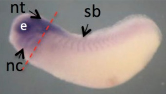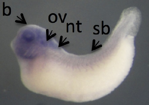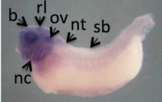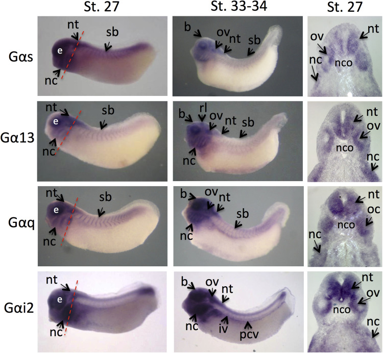 Fig. 6. Spatial expression pattern of the four representative Gα subunits during later Xenopus tropicalis development. The tissue specific expression patterns of Gα subunit transcripts at different stages of X. tropicalis embryonic development were analyzed by whole-mount in situ hybridization. Probes are indicated to the left of each panel row, and the developmental stages are indicated at the top of each panel column. Lateral views are shown for embryos at stages 27, and 33â34. Right panels show cross-section in situ hybridization analysis of Gα subunits from stage 27 X. tropicalis embryos. Embryos were coronally sectioned to a thickness of 25â30 μm by a Leica VT1000M vibratome. In left panels, the red dotted lines in the stage 27 embryo indicate the position of the visualized sections. The eye (e) is indicated in white lettering. Black arrows indicate specific structures labeled as follows: b, brain; iv, intersomitic veins; nc, neural crest; nco, notochord; nt, neural tube; ov, otic vesicle; p, placodes; pcv, posterior cardinal vein; rl, rombic lip; and sb, somite boundaries. The embryo images are representative of three independent in situ experiments analyzing 30â50 embryos each time.