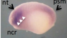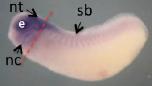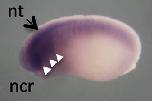 gna13 (guanine nucleotide binding protein (G protein), alpha 13) gene expression in Xenopus tropicalis embryo, assayed via in situ hybridization, NF stage 18, lateral view, anterior left, dorsal up. Inset, dorsal view, anterior up.