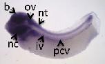 gnas (GNAS complex locus) gene expression in Xenopus tropicalis embryo, assayed via in situ hybridization, NF stage 24, lateral view, anterior left, dorsal up.