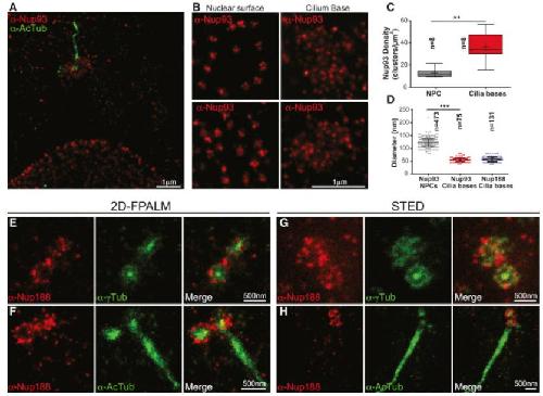 Figure 5. Nups Do Not Form NPC-like Rings at Cilia Bases (A) 2D FPALM super-resolution image of a cell co-stained with anti-Nup93 (red; AF647) and anti-AcTub antibodies (green; Cy3B). (B) Higher-magnification views of the nuclear surface (left panels) and the cilium base (right panels) of two different cells stained with anti-Nup93 (AF647). (C) Box plot where the density of localization clusters at the nuclear envelope and cilia bases are directly compared. The box depicts the 25th to 75th percentiles with the median marked as a horizontal line in the box. The whiskers mark the data range from the smallest to the largest value. â+â indicates the mean of the distribution (n represents number of cells). ââp < 0.005, Studentâs t test. (D) Plot of the diameter (mean ± SD) of localization clusters at the nuclear envelope and cilia bases. n represents number of localization clusters from three independent experiments. âââp < 0.0005, Studentâs t test. (E) 2D FPALM images of anti-Nup188 (red; AF647) and anti-γTub antibodies (green; Cy3B) with merge on right. (F) As in (E) except with anti-AcTub co-stain. (G) STED images of a cell co-stained with anti-Nup188 (red; ATTO647N) and anti-γTub antibodies (green; ATTO594) with merge on right. (H) As in (G) except with anti-AcTub co-stain. See also Figure S4. |