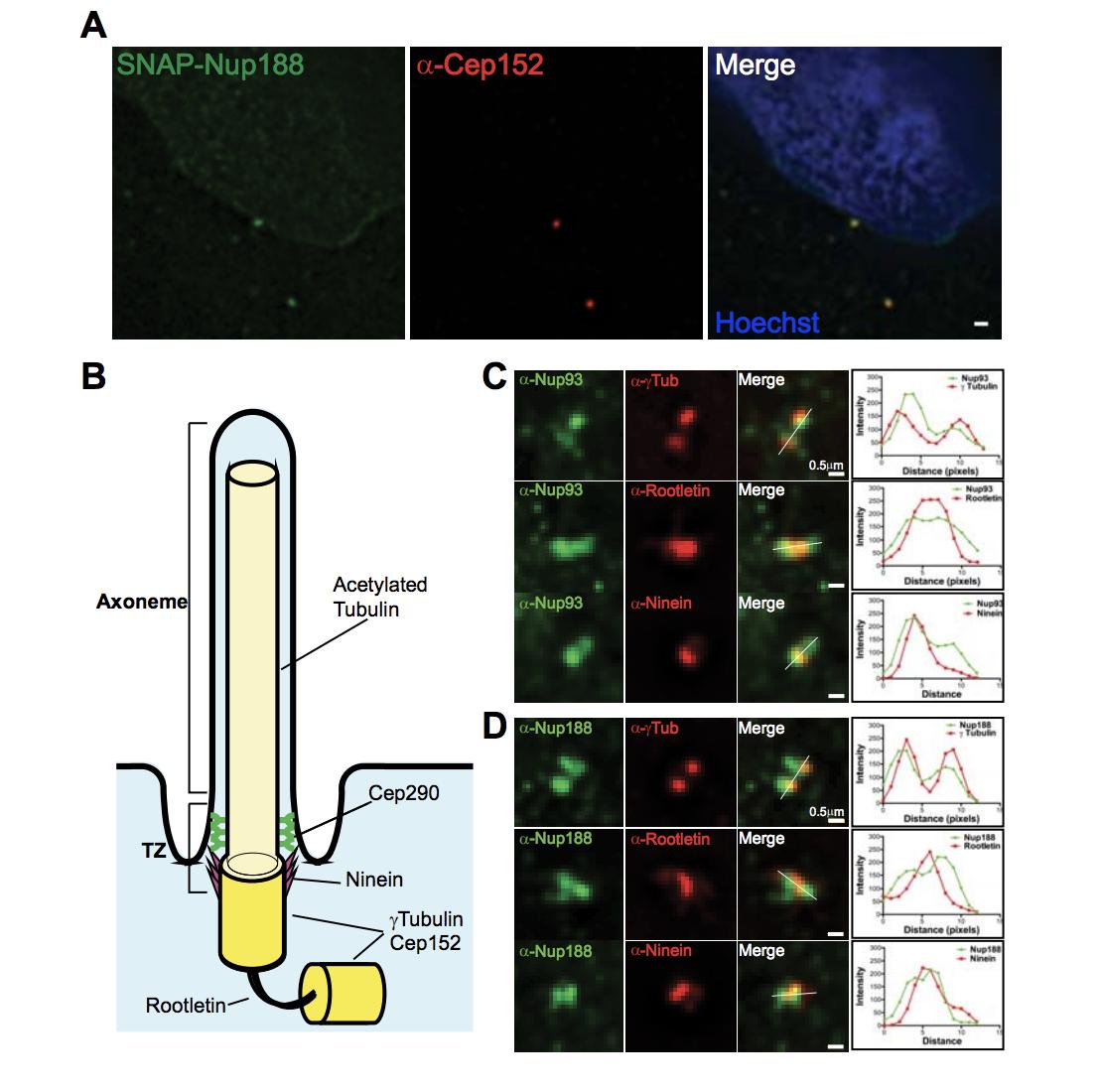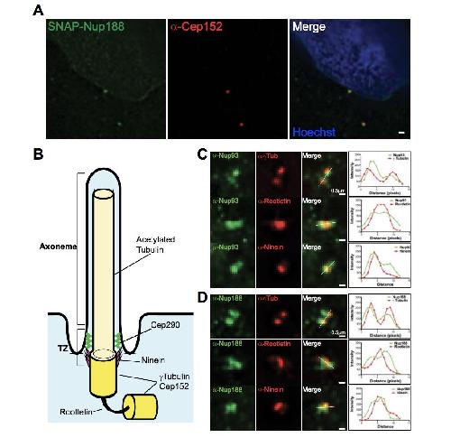 Figure S3 (related to Figure 4): Nup93/188 localize to the mother and daughter centriole. (A) An overexpressed SNAP-Nup188 co-localizes with centrioles. Fluorescent micrographs of HeLa cells expressing SNAP-Nup188 detected with the oregon-green SNAP substrate. Centrioles were detected with an anti-Cep152 antibody (red) and DNA stained with Hoechst (blue) in merge panel. (B) Schematic of the cilium. BB is basal body (mother centriole), DC is daughter centriole and TZ is transition zone. (C) Nup93 localizes to the BB and DC. Deconvolved fluorescent micrographs of the bases of cilia in RPE cells immunostained with the indicated anti-Nup93 antibodies (green) and those that stain different components of the cilium base (red). Pixels under the white line in merged image were used to generate line profile plots in right panels. (D) Nup188 localizes to the BB and DC. Deconvolved fluorescent micrographs of the bases of cilia in RPE cells immunostained with the indicated anti-Nup188 antibodies (green) and those that stain different components of the cilium base (red). Pixels under the white line in merged image were used to generate line profile plots in right panels. |