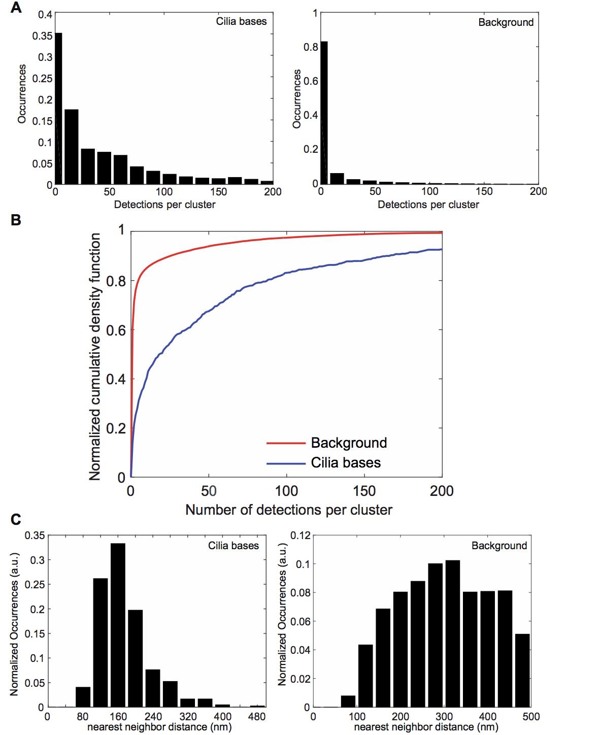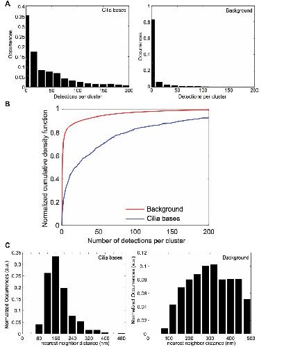 Figure S5 (related to Figure 6): Nup188 is found in multiple copies within evenly spaced clusters at the cilium base. (A) The number of anti-Nup188 localizations (detections) per cluster from 10 W-4PiSMSN images of cilia bases (left) and corresponding randomly selected regions (right). (B) Cumulative density distribution of data shown in A for better visualization of histograms. (C) Nearest neighbor distance distribution between the cilia bases (left; reproduced from Figure 6B) and randomly selected locations from 17 images (right). a.u. is arbitrary units. |