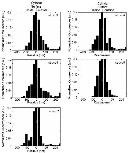 Figure S6 (related to Figure 6 and movie S3): Distribution of anti-Nup188 single molecule detections with reference to cylinder surface. Distribution of the distances of single molecule detections of 5 cylinder-modeled Nup188 structures (see Movie S3) showing a compact distribution around the cylindrical surface. Negative values indicate the detections are within the cylinder and positive values are outside. |