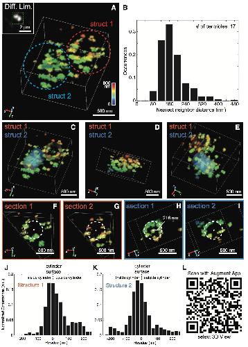 Figure 6. Nup188 Forms Two Barrel-like Structures that Encase the Centrioles (A) Diffraction-limited (inset) and 3D W-4PiSMSN super-resolution image of anti-Nup188 signal at the cilium base. Heatmap coloration reflects depth in z as depicted by scale. Individual structures are circled. See also Movie S2. (B) Nearest-neighbor distances from all localiza- tion clusters in all structures imaged were calcu- lated and plotted. (C–E) Rotated views of image in (A) where two cylinders (blue and red) have been fitted into both structures denoted by ‘‘1’’ and ‘‘2.’’ See also Movie S2. (F–I) Planar sections of each structure cut across the cylinder axis (central point). Dotted lines represent cylinders. (J and K) Distribution of the distances of individual localizations from W-4PiSMSN data inside (nega- tive values) and outside (positive values) the modeled cylinder surface of structure 1 (J) and structure 2 (K). (L) QR code to load Nup188 W-4PiSMSN structure into the 3D visualization application Augment. See Experimental Procedures for instructions. See also Figures S5 and S6. |