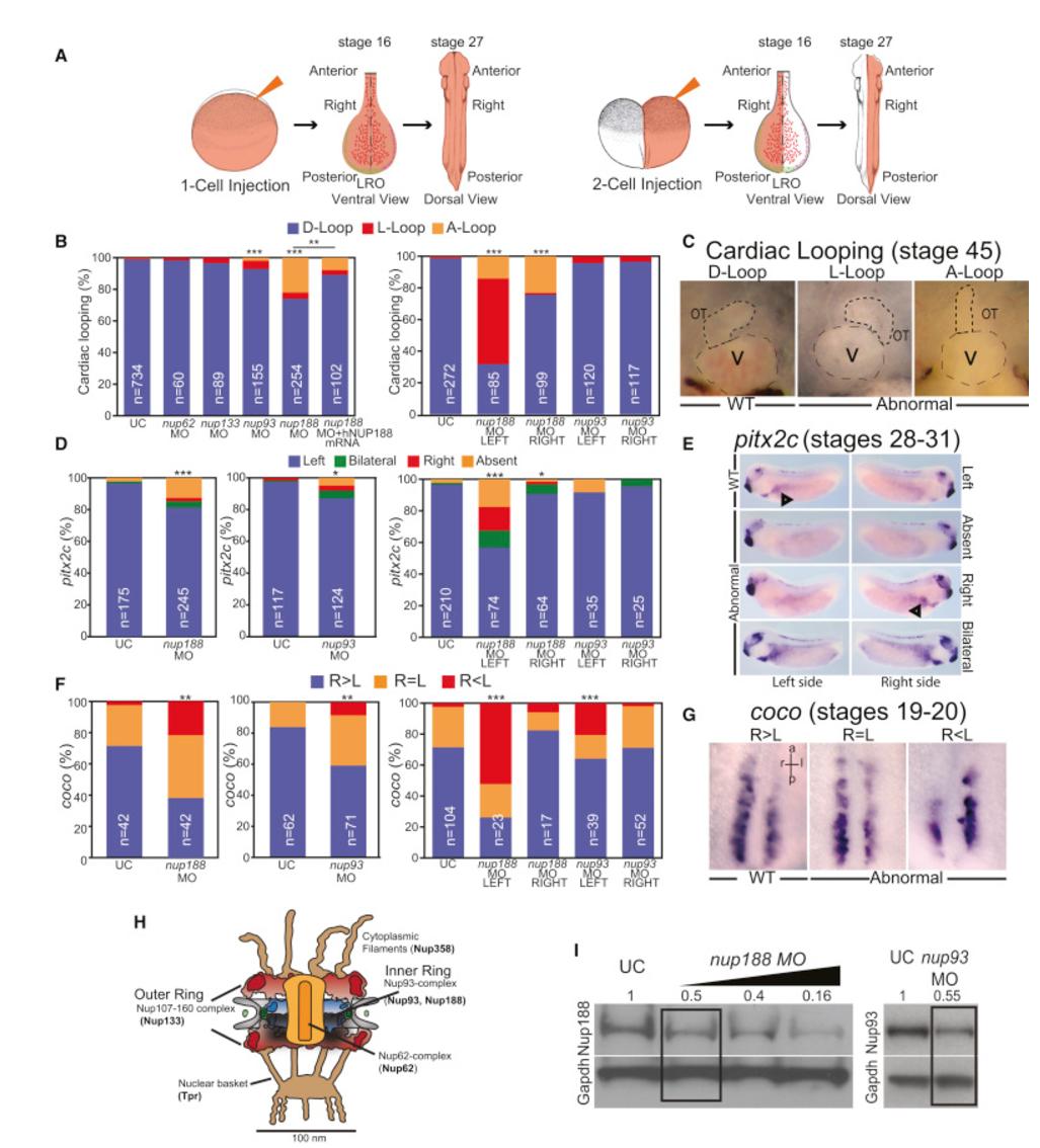 Figure 1. Depletion of Inner-Ring Nups Alters LR Patterning (A) One- (left) and 2-cell (right) injection schematic (not to scale) showing a salmon-colored dye as a tracer. When injections are done in one cell at the 2-cell stage, embryos are selected where either the left or the right side of the embryo is targeted, as shown in the diagram of dissected LRO (stage 16) or in a later stage-27 embryo. Small red lines in LRO represent cilia. (B) Percentage of embryos with abnormal cardiac looping (see C for key to score cardiac looping) after MO injection at 1-cell stage (left) or 2-cell stage (right). nup188 morphant heart looping defects are rescued by human NUP188 expression (left). n represents total number of embryos from three independent experiments. âââp < 0.0005, ââp < 0.005, chi-squared/Fisher's exact test. UC, uninjected controls. (C) Examples of cardiac looping phenotypes of wild-type and abnormal Xenopus hearts at stage 45 viewed ventrally with anterior at the top. D-Loop: normal outflow track (OT) loops right (short dashed line). L-Loop: abnormal OT loops left. A-Loop: abnormal OT is unlooped. Ventricle (V) is bound by a long dashed line. (D) Percentage of embryos with abnormal pitx2c (see E for key to score pitx2c staining) after MO injection at 1-cell stage (left, middle) or 2-cell stage (right). n represents total number of embryos from three independent experiments. âââp < 0.0005, âp < 0.05, chi-squared/Fisher's exact test. (E) Example key of pitx2c expression showing lateral views of embryos (stages 28â31) with dorsal at the top. Arrowheads point to pitx2c in the lateral plate mesoderm. (F) Percentage of embryos with abnormal coco expression (see G for key for coco scoring) after MO injection at 1-cell stage (left, middle) or 2-cell stage (right). L and R denote left and right side of LRO, respectively. n represents total number of embryos from three independent experiments. âââp < 0.0005, ââp < 0.005, chi-squared/Fisher's exact test. (G) Example key of coco expression patterns in the LRO at stages 19â20. Ventral views with anterior at the top. (H) Schematic of NPC. Nups referred to in this study are in bold. (I) Nup188 and Nup93 protein levels determined by western blot. Numbers are relative protein levels normalized to Gapdh with triangle reflecting dose of MO. Boxed lane indicates dose used for all experiments. See also Figures S1 and S2. |