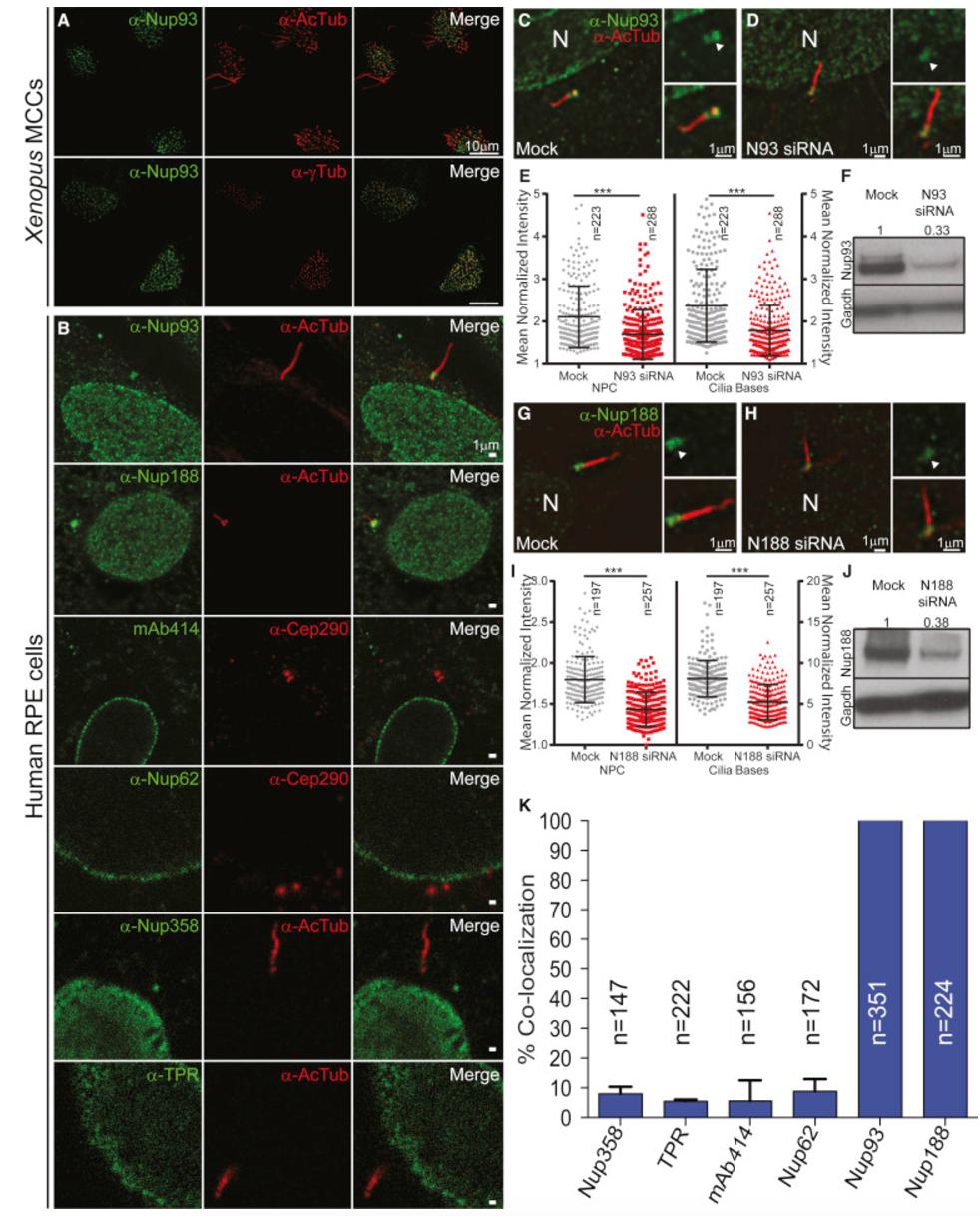 Figure 4. Nup188 and Nup93 Specifically Localize to the Bases of Cilia (A) Immunofluorescence images of Xenopus epidermal MCCs stained with anti-Nup93 (green) and either anti-AcTub (red, top) or anti-γTub (red, bottom) antibodies with merge. (B) Immunofluorescence images of human RPE cells stained with the indicated anti-nup antibodies (left) with anti-AcTub, anti-γTub, or anti-Cep290 (middle) and merge (right). See Figure S3B for location of cilia-specific epitopes. (C) Anti-Nup93 antibodies are specific. Fluorescence image (merge of green and red channels) of representative scrambled (mock) siRNA-treated RPE cell stained with anti-Nup93 (green) and anti-AcTub (red) antibodies. Panels on right are higher magnification of cilium base showing just the anti-Nup93 signal (green; top) and merge of anti-Nup93 and anti-AcTub (red) images (bottom). Arrowhead points to cilium base. N denotes the nucleus. (D) Identical to (C) except that cells are treated with siRNAs specific to NUP93 (N93). (E) Plot of normalized fluorescence intensity in a.u. of anti-Nup93 signal at cilium base and NPCs of individual cells treated with scrambled (mock) or specific NUP93 (N93) siRNAs. Mean ± SD is indicated; n represents total number of cells/cilia from three independent experiments. âââp < 0.0005, Studentâs t test. (F) Western blot of Nup93 levels after siRNA transfection; numbers are quantification of protein levels relative to Gapdh. (GâJ) Anti-Nup188 antibodies are specific. Panel layout is identical to (C)â(F) except that cells are treated with scrambled (mock) or siRNAs specific to NUP188 (N188). (K) Plot of percentage of cells in which the anti-nup signal co-localizes with a cilium-base marker. Mean ± SD is indicated; n represents total number of cells from three independent experiments. See also Figures S1 and S3. |