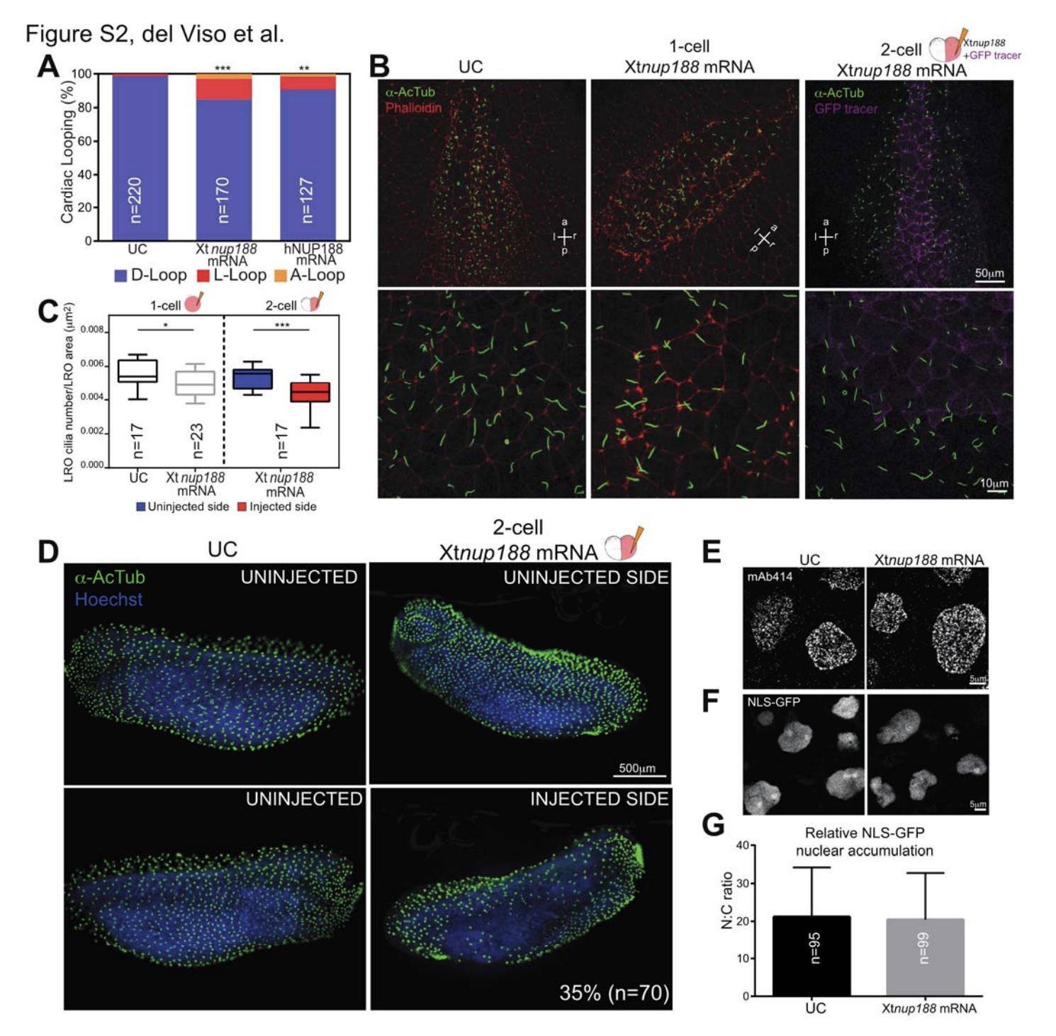 Figure S2 (related to Figures 1, 2 and 3): Nup188 overexpression specifically affects cardiac looping and cilia. (A) Overexpression of Nup188 affects heart looping. To drive overexpression of Nup188, Xenopus tropicalis (Xt) nup188 mRNA or human (h) NUP188 mRNA were injected at 1-cell stage. Plot shows the percentage of resulting embryos with cardiac looping defects. Chi-Square or Fisherâs Exact Test, ***p<0.0005, **p<0.05. n=total number of embryos from 3 independent experiments. (B) LROs from control embryos (UC) and embryos injected with the Xtnup188 mRNA at the 1 or 2-cell stage. Primary cilia were stained with anti-AcTub (ï¡-AcTub, green). Phalloidin was used to mark cell borders (red). Xtnup188 mRNA was traced using an mRNA encoding for a GFP-tagged plasma membrane protein (magenta). p,a,l,r: posterior, anterior, left, right, respectively. (C) Box plots show cilia number per LRO area (µm2) of UC and embryos injected at the 1 or 2-cell stage with Xtnup188 mRNA. The box depicts the 25th to 75th percentiles with the median marked as a horizontal line. The whiskers mark the data range from the smallest to the largest value. In embryos injected at the 2-cell stage, blue boxes are the uninjected side and red boxes the injected side. n=total number of embryos from 2 independent experiments, T-test, *** p<0.0005, * p<0.05. (D) Xenopus embryos were injected with Xtnup188 mRNA into 2-cell stage such that half the embryo receives the mRNA (See Figure 1A for a visual guide to these experiments). Fluorescence images are lateral views, with dorsal at the top, of both sides (uninjected and injected) of a single embryo with the cilia of the MCCs labeled with anti-AcTub (green). Nuclei stained with Hoechst (blue). The disruption of cilia on the injected side was found in 35% (n=70) of embryos from 2 independent experiments. (E) Fluorescent images of NPCs stained with the mAb414 antibody in animal caps of UC and embryos injected with Xtnup188 mRNA. (F) Fluorescent images of embryos co-injected with mRNA encoding NLS-GFP and Xtnup188 mRNA. Animal caps were dissected and allowed to develop MCCs before imaging. (G) Embryos were co-injected with mRNA encoding NLS-GFP and Xtnup188 mRNA. Graph shows the nuclear/cytoplasm (N:C) ratio of mean NLS-GFP fluorescence intensities and the SD. n=total number of nuclei from 3 independent experiments. |