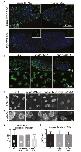Figure S1 (related to Figures 1,2,3 and 4): Nup188 and Nup93 are required for cilia in mammalian cells and Xenopus. (A) Nup62 and Nup133 protein levels after MO injection. Western blots of Nup62 and Nup133 in both uninjected controls (UCs) and embryos injected with nup62 and nup133 MOs (nup62 MO doses: 5 and 10ng/embryo) (nup133 MO doses: 2.5, 5 and 10ng/embryo). Numbers above each lane indicate the band intensity normalized to Gapdh (loading control). Boxed lanes indicate the dose used in epidermal cilia stain in Figure 3B. (B) Nup188 is required for cilia in human RPE cells. Merged (green and blue channels) fluorescent images of human RPE cells induced to ciliate after knockdown of Nup188 or Nup93 using specific siRNAs or scrambled (mock) control. Cilia are stained with an Arl13b antibody (green) and DNA with Hoechst (blue). See also Figure 4F and 4J for degree of knockdown. (C) Nup188 depletion in RPE cells leads to decreased ciliation. Plot of percentage of ciliated cells after knockdown of Nup188 or Nup93 using specific siRNAs in human RPE cells. n=total number of nuclei/cilia from 3 independent experiments. Chi-Square Test, *** p<0.0005. (D-F) Loss of nup93 affects gliding in Xenopus embryos. (D) At stages 28-31, wildtype embryos glide along the surface of an agarose-coated dish due to the beating of multiciliated cells while nup93 morphants do not. Brightfield images of 2 UCs (top) and 4 nup93 morphant embryos (bottom). (E) Same field as (D) but nup93 morphants are identified by Alexa488 tracer dye (bottom 4 green morphants). (F) Video frame captures of the same UC and morphant embryos in (D) and (E) gliding at indicated times. See also Movie S1. (G) Nup93 is specifically required for epidermal cilia. Plot of the percentage of embryos with abnormal epidermal cilia assessed by anti-AcTub staining after injection at 1-cell stage with nup93 MO (1 ng/embryo) or (to assess specificity) with nup93 MO combined with human (h) NUP93 mRNA (50 or 100 pg/embryo). Bottom panel is a key (blue, green, orange, red) to our qualitative assessment of cilia shown as example fluorescent images of embryos (lateral views, dorsal at top) stained with anti-Actub (green) and Hoechst (blue). n=total number of embryos from 3 independent experiments, Chi-Square Test, *** p<0.0005. (H-I) Cilia loss in nup morphants is not due to changes in cilia cell type specification. (H) In situ hybridizations images with a foxj1-specific probe of stage 10.5 embryos injected with the indicated MOs or with Xtnup188 mRNA. Vegetal views of embryos with blastopore lip to the top are shown as representative examples of 2 independent experiments. Numbers indicate the number of embryos showing the same staining pattern. (I) In situ hybridizations images with a foxj1-specific probe of stage 28-31 embryos injected with the indicated MOs. Left, lateral views of embryos with dorsal at the top are shown as representative examples of 3 independent experiments. (J) Nup188 and Nup93 depletion affects multiciliated cells in Xenopus epidermis. Fluorescent images of epidermal animal caps derived from UC embryos or those injected with the indicated MOs; multiciliated cells (MCCs) labeled with anti-AcTub (green). Two z-sections (top and bottom panels) at the indicated focal planes are shown |