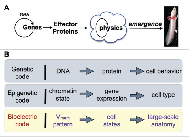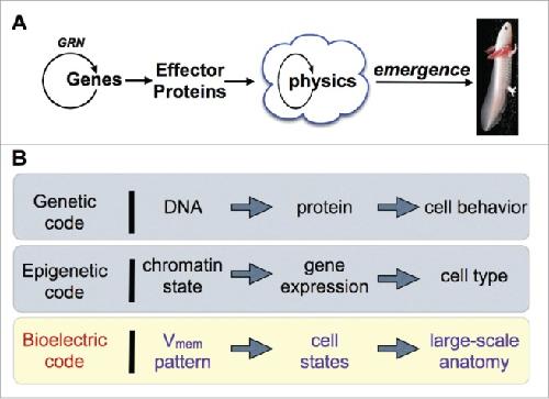 Figure 1. Interplay of genetics and physics. (A) The process of developing an organism from a fertilized egg cell involves an interplay of physics and genetics. Transcriptional gene-regulatory networks (GRNs) specify the production of effector proteins that allow coupling to specific physical processes (adhesion, tension, electric propagation, diffusion, etc.). It is the emergent order in those physical processes that ultimately results in a specific 3-dimensional shape of the body and its internal organs. (B) At least 3 codes participate in this process. The genetic code, which maps DNA sequence to protein sequence, controls cell behavior. The Epigenetic code, which maps chromatin state to expression of specific genes, regulates cell type and physiological properties. The bioelectric code maps the distribution of endogenous voltage gradients and electric fields in vivo, and appears to regulate large-scale anatomical patterning.54,55,75,108 |