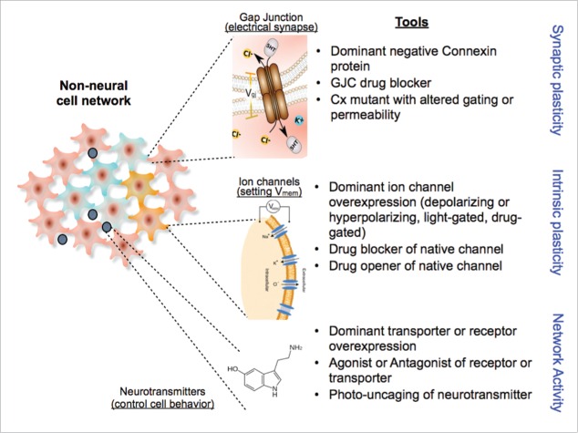 Figure 2. Bioelectric networks and their modulation. Many tissues, not only the nervous system, maintain active electrical communication among cells. Developmental bioelectricity, as in neurons, relies on ion channels and pumps to produce resting potential gradients across their cell membranes, and gap junctional channels to spread those potentials to neighboring cells. Signals within this network are mediated by the transfer of current and small molecules such as neurotransmitters. Because many ion channels and gap junctions are themselves voltage-sensitive, this system can support complex dynamics; the output of these dynamics includes changes in gene expression and cell behavior, mediated by transduction machinery such as neurotransmitter flux. Experimental (and endogenous) modulation of these dynamics can occur via regulation of gap junctional connectivity within the network (targeting gap junctions to alter plasticity of the electrical synapses), changes in ion channel activity (editing of resting potentials as a kind of intrinsic plasticity), or direct effects on the resulting gradients of neurotransmitters. A wide variety of genetic, pharmacological, and optical tools are now available to manipulate physiological networks in developmental or regenerative contexts in vivo. Graphics by Alexis Pietak. |