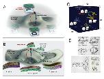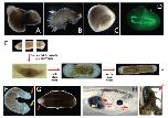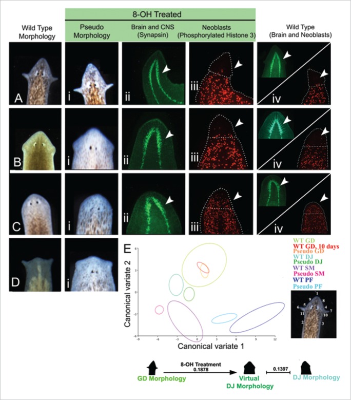 Figure 3. Changes to species-specific head shape in planaria. Physiological determination of species-specific head anatomy in the planarian flatworm. Transient exposure to octanol after amputation in G. dorotocephala results in regeneration of head anatomies resembling other species of planarian. Brain shape and distribution of neoblasts is also altered. Shape change can be quantified using geometric morphometrics, and used to produce a shape space accounting for much of the variation in shape between species. (A) Wild type G. dorotocephala morphology. (Ai) pseudo G. dorotocephala morphotype after octanol treatment. (Aii) brain morphology of pseudo G. dorocephala morphology by anti-synapsin immunostaining. (Aiii) neoblast distribution of pseudo G. dorotocephala morphology by anti-phosphorylated histone 3 immunostaining. (Aiv) wild type G. dorotocephala brain morphology and neoblast distribution. (B) Wild type D. japonica morphology. (Bi) pseudo D. japonica morphotype after octanol treatment. (Bii) brain morphology of pseudo D. japonica morphology by anti-synapsin immunostaining. (Biii) neoblast distribution of pseudo D. japonica morphology by anti-phosphorylated histone 3 immunostaining. (Biv) wild type D. japonica brain morphology and neoblast distribution. (C) Wild type S. mediterranea morphology. (Ci) pseudo S. mediterranea morphotype after octanol treatment. (Cii) brain morphology of pseudo S. mediterranea morphology by anti-synapsin immunostaining. (Ciii) neoblast distribution of pseudo S. mediterranea morphology by anti-phosphorylated histone 3 immunostaining. (Civ) wild type S. mediterranea brain morphology and neoblast distribution. (D) wild type P. felina morphology. (Di) pseudo P. felina morphotype after octanol treatment. (E) CVA analysis of wild type morphologies and pseudo morphologies, with morphometric landmarks shown on a wild type G. dorotocephala head. Figures used with permission from ref. 163. |