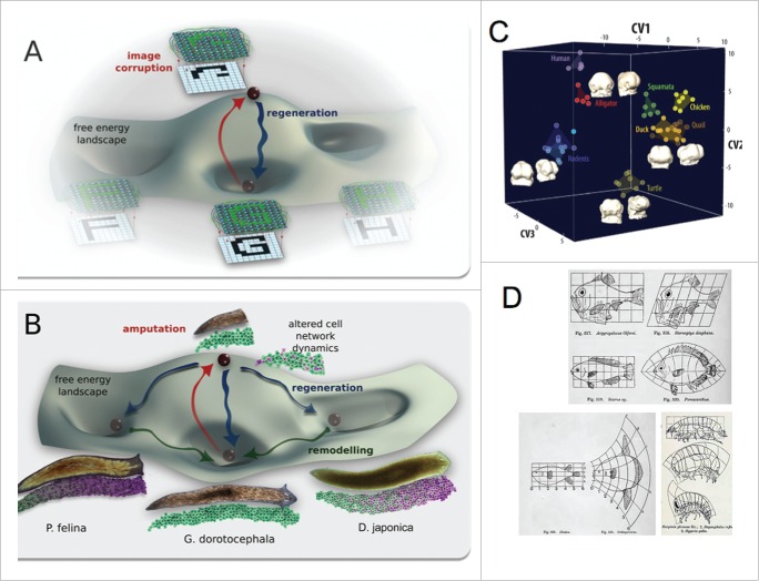 Figure 4. Morphogenetic state spaces. A conceptual model of shape change driven by physiological network dynamics. Planaria regeneration parallels classical neural network behavior; both can be described in terms of free energy landscapes with multiple attractor states. (A) Behavior of a classical Hopfield neural network trained to reproduce 3 types of patterns, in this case shapes of the letters ‘F’, ‘H’, or ‘G’, which are the 3 stable states of the network's free energy landscape. The state of the Hopfield network's nodes directly relate to the brightness of pixels on a display, generating output. Perturbation of the network from a stable state (red arrow) by deleting (damaging) part of the pattern is akin to moving a ball to an unstable point on the free energy landscape, and leads to regeneration of the closest learned attractor state (blue arrow). In this, such networks' well-known ability to implement memory is analogous to regenerating organisms restoring a specific target morphology upon damage. (B) The parallel concept of planaria regeneration into head shapes of one of 3 different species, which are attractor states of the free energy landscape. Outcome morphology is driven by the dynamic outputs of physiological cellular network. Amputation (red arrow) is akin to moving the system to an unstable point on the free energy landscape. Normal regeneration would return the system to its main attractor, but altering cell network dynamics via gap junction blockade allows for regenerative transitions (blue arrow) to alternative local minima, corresponding to morphospace regions normally occupied by P. felina and S. mediterranea worms. In time, remodeling (green arrow) transfers these morphologies to the global minimum of the wild-type state (G. dorotocephala). (C) Morphospaces are conceptual structures within which distances along specific metrics can represent the differences among species' morphologies. This panel illustrates how variants in the shape of a structure (skull shapes in this case) can be represented in a virtual space describing several orthogonal control parameters. We suggest that the physiologically-induced conversion of an animal with a normal genome into a different species-specific morphology could be modeled by an appropriate bioelectric circuit model whose measured states control relevant parameters forming the axes of a morphospace. Such spaces often include stable attractors corresponding to anatomical configurations that stable to small perturbations of the key parameters. (D) It is possible that the global coordinate axes that facilitate the Thompson transformations are mediated by bioelectric field properties across the organism. Images used with permission as follows: A,B,163 C,113 D.115 |