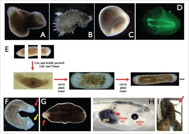 Figure 5. Unexplored regions of morphospace reached by editing bioelectric circuits. Briefly altering bioelectric circuit dynamics, despite the presence of a normal genome, can result in drastic alterations of the bodyplan, to regions not currently occupied by extant species. D. japonica worms treated with disruptors of gap junctional connectivity or modulators of ion channel-depenedent bioelectric signaling can acquire compound (A), spiky (B), or cup-shaped (C) morphologies instead of the genome-default flat architecture of the planarian. The specimen in panel D has been stained with an antibody to reveal the central nervous system, and cleared to highlight the pocket-like morphology. In some cases, these edits to the normal target morphology can be permanent (E): a flatworm middle fragment that regenerates 2 heads after a brief reduction of bioelectrical coupling among its cells will continue to regenerate as 2-headed in subsequent cuts made in plain water. Even if the “reprogrammed” head tissue is removed, the target morphology information in other fragments of the body have been physiologically altered so that a 2-headed form results. This new worm architecture has distinct behavioral and anatomical structures and is stable across the most common mode of reproduction in this species (fission + regeneration), stretching the definition of speciation. (F) Changes of head shape (red arrowhead) and number (yellow arrow) can occur in the same animal, as can changes in head size (G, red arrow). Editing of large-scale bodyplan can be induced in vertebrate models as well, inducing ectopic eye growth out of gut tissue (red arrow), and ectopic limb growth out of the mouth (I, red arrow). Images used with permission as follows: E,53 G,124 H.67 Photo in panel I courtesy of Erin Switzer. |