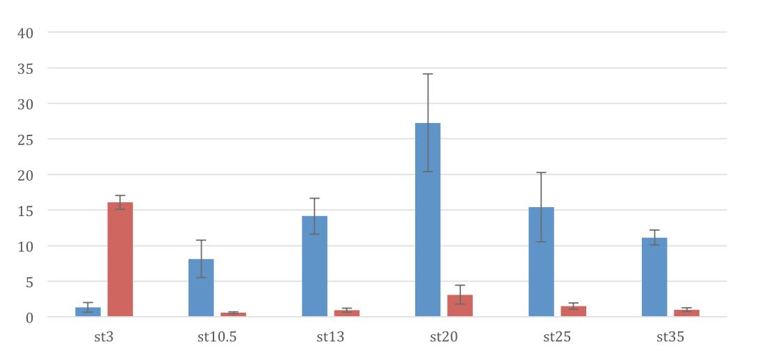 different developmental stages (x axis) were analyzed by qRT-PCR. The